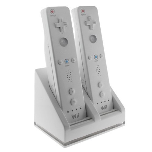 - Use this charging station to charge up to two (2) Wii controllers at a time. Light shines red when charging and blue once charged.